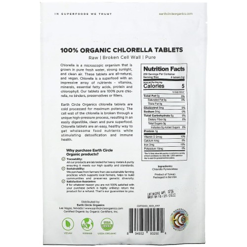 Earth Circle Organics chlorella tablets are cold processed for maximum potency. The cell wall of the chlorella is broken through a unique high-pressure process, resulting in an easily digestible, clean and pure superfood. Chlorella tablets are an easy, healthy way to get wholesome food nutrients while stimulating detoxification and immune health.